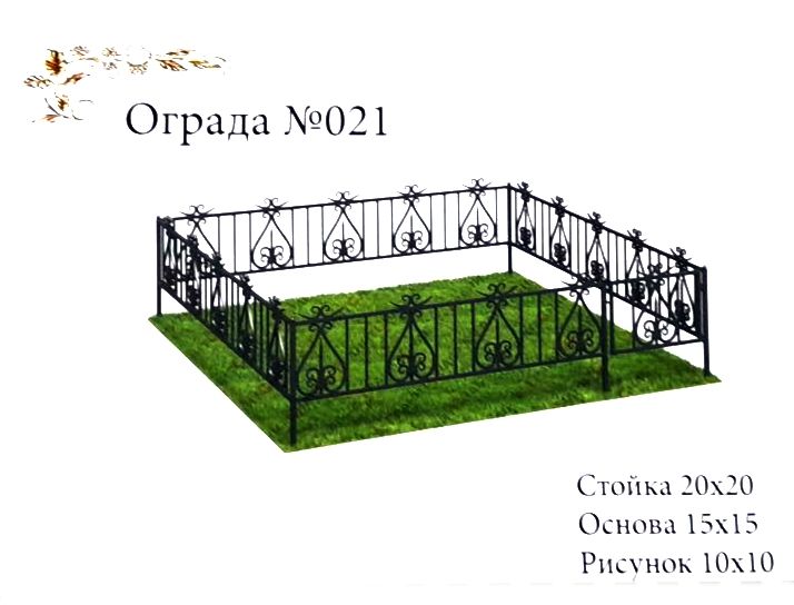 Ограда № 21 - это стильное и надежное решение для оформления кладбища и создания достойного памятника на могиле. Изготовлена из высококачественного металла с использованием стойки размером 20x20 см, основы 15x15 см и рисунка 10x10 см.