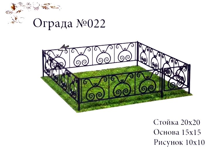 Ограда № 22 - идеальное решение для благоустройства могил на кладбище. Комплект включает в себя стойку размером 20х20, основу 15х15 и рисунок 10х10. Этот продукт отличается высоким качеством материалов и прочной конструкцией.