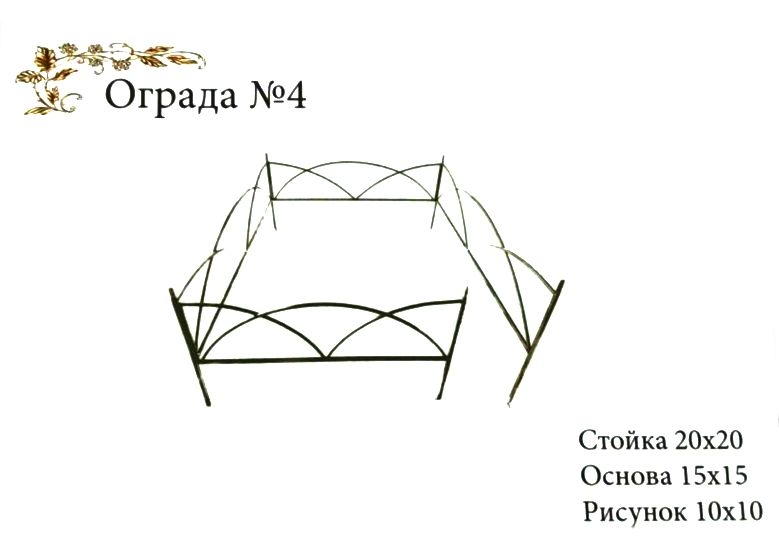 Ограда № 4 - это стильное и надежное решение для благоустройства могил на кладбище. Изготовленная из металлических материалов, она включает в себя стойки размером 20x20, основу 15x15 и рисунок 10x10, что придает ей эстетичный вид.