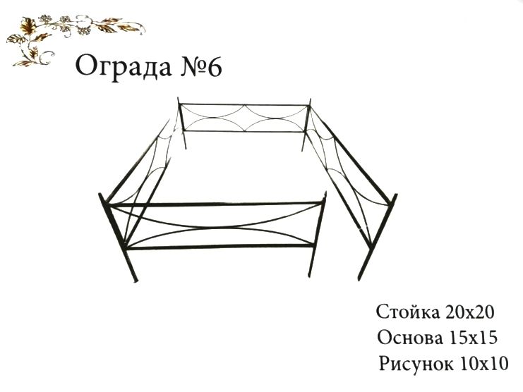 "Ограда № 6" - это элегантное решение для оформления могил на кладбище. Изготовленная из прочного металла, ограда имеет стойку размером 20x20 мм и основу 15x15 мм, с рисунком размером 10x10 мм, которые придают ей изысканный вид.